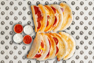 Салат из томатов, куриного микса со специями, зеленого салата, сладкого перца, сыра чеддера в аппетитном блинчике.