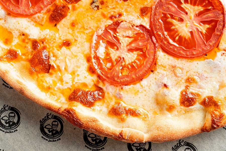 Состав: мука, сыр Моцарелла, соус томатный, помидоры, сыр Пармезан, масло оливковое, дрожжи, чеснок, травы, специи.