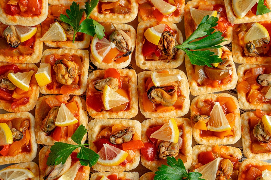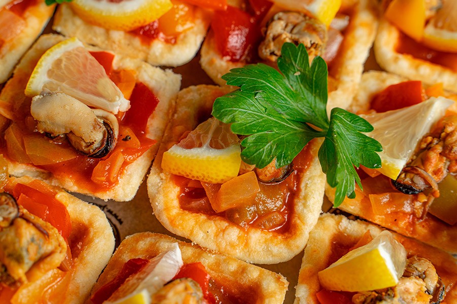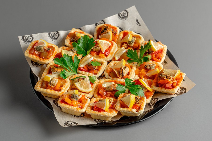 Тарталетки с салатом из мидий, сладкого перца, репчатого лука и кетчупа с красным сухим вином, чесноком, растительным маслом, солью и кайенским острым перцем украшены дольками лимона и листиками китайского салата.