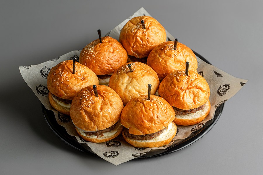 Мини-гамбургеры с сочной котлетой из 100% говядины с майонезом, «Дижонской» горчицей, кольцами лука, кетчупом на нежной булочке с кунжутом.