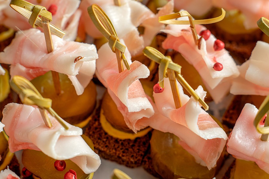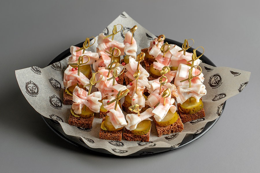 Ломтик нежнейшего шпика с маринованным огурчиком и петрушкой на тостике с горчицей. Блюдо украшено зернышками розового перца.