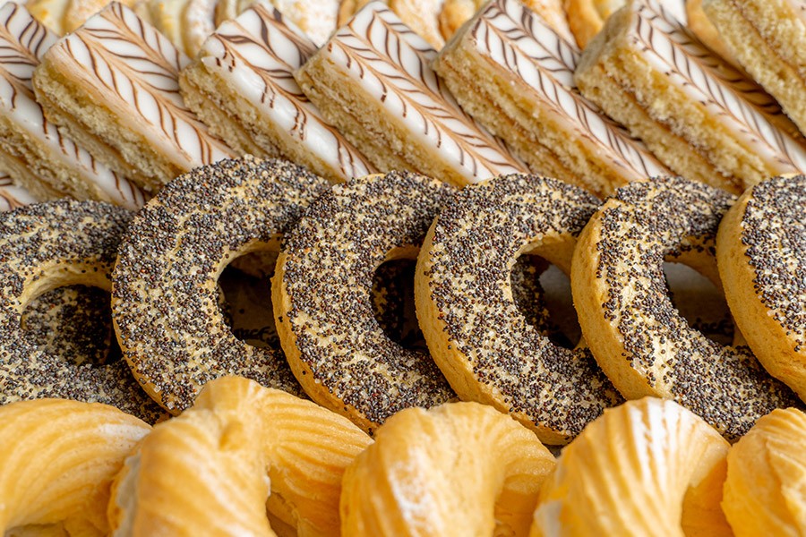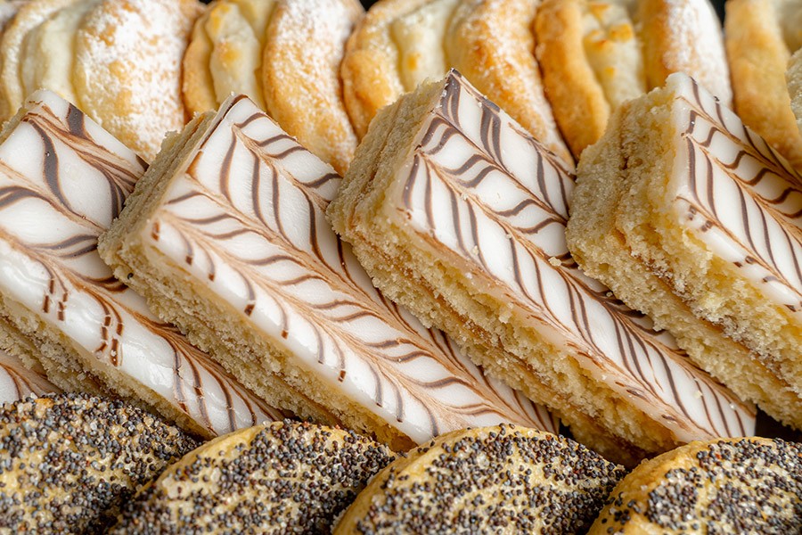 2) Песочная полоска – рассыпчатое пирожное, состоящее из двух песочных коржей, прослоенных яблочным повидлом. Верхний корж покрыт белой сахарной помадкой и украшен шоколадным узором. Имеет нежную, тающую во рту текстурой и выраженный сливочный вкус (10 шт.);