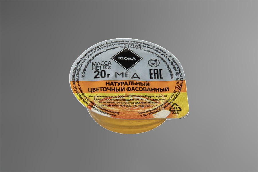 Мёд цветочный натуральный в порционной упаковке. Прилагается прозрачная пластиковая ложка 100 мм в пакете.