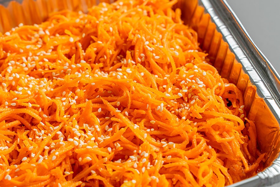 Тонкие ломтики свежей моркови, выдержанные в пикантном маринаде из чеснока, кориандра, сахара, столового уксуса и перца чили. Подаются с семенами белого кунжута.