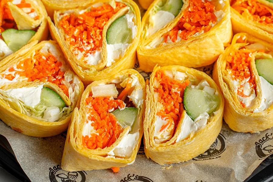 Кукурузная лепешка тортилья с начинкой из нежного сыра, морковки по-корейски, свежего огурца и болгарского перца.