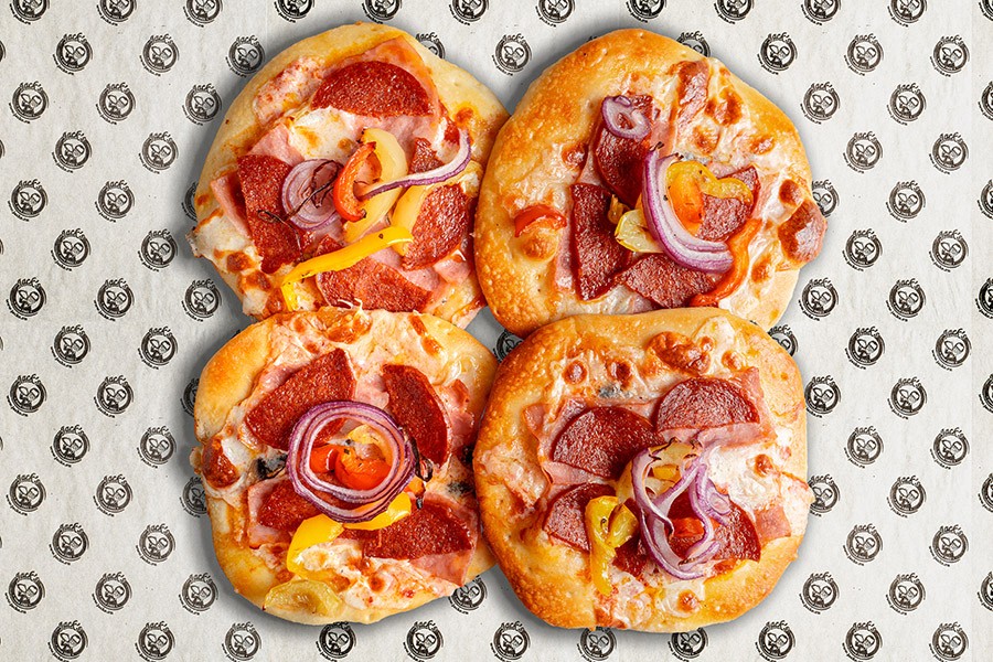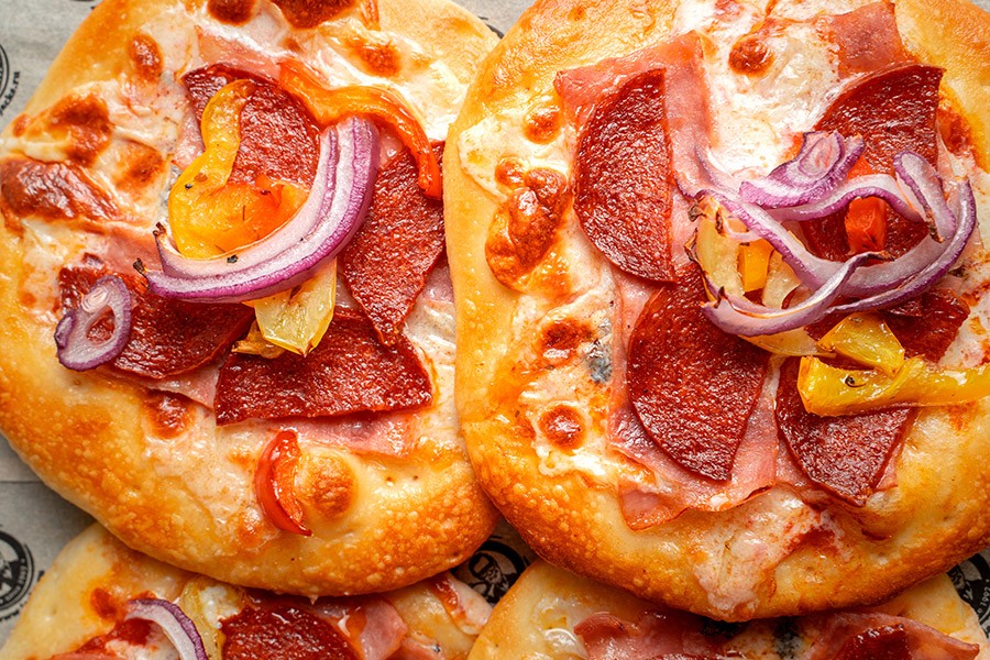 Пиццетты на тонком тесте с колбаской Пепперони, ветчиной, шампиньонами, луком и сладким перцем.