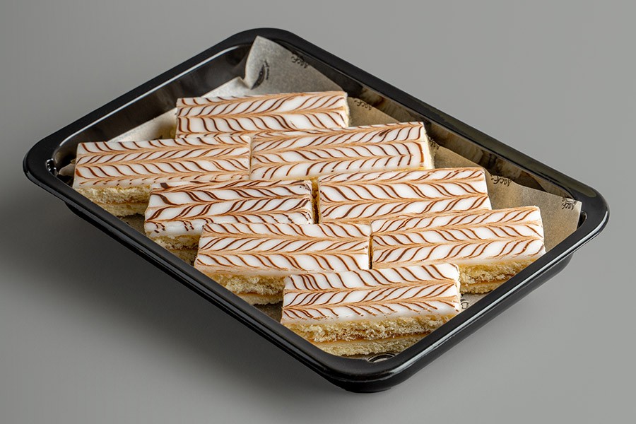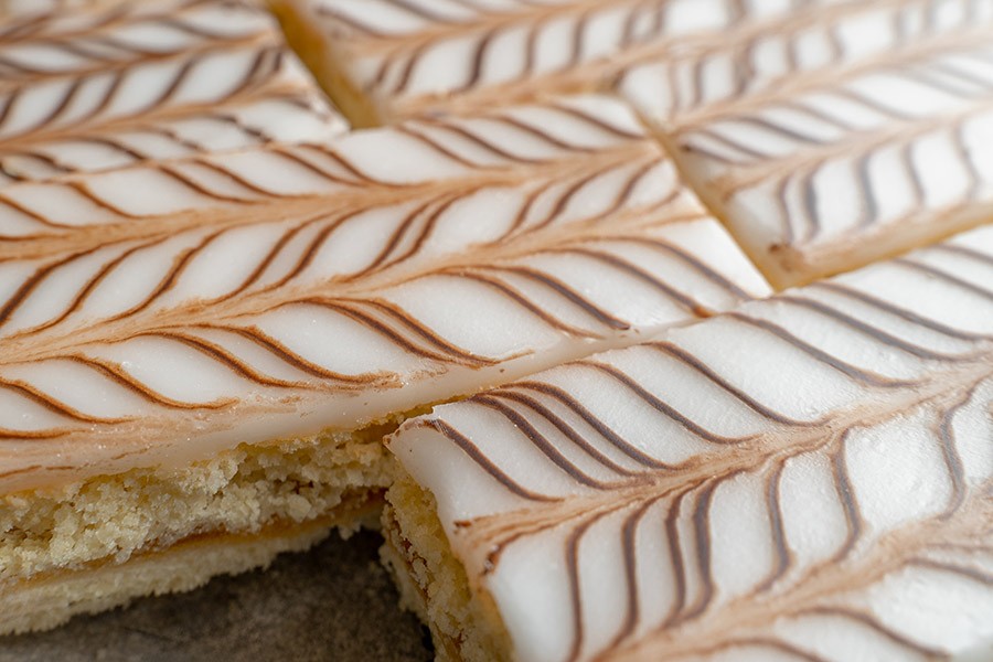 Классическое рассыпчатое пирожное «из детства», состоящее из двух песочных коржей, прослоенных яблочным повидлом. Верхний корж покрыт белой сахарной помадкой и украшен шоколадным узором. Характеризуется нежной, тающей во рту текстурой и выраженным сливочным вкусом.