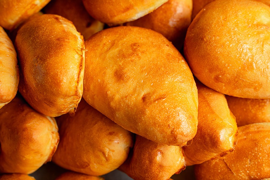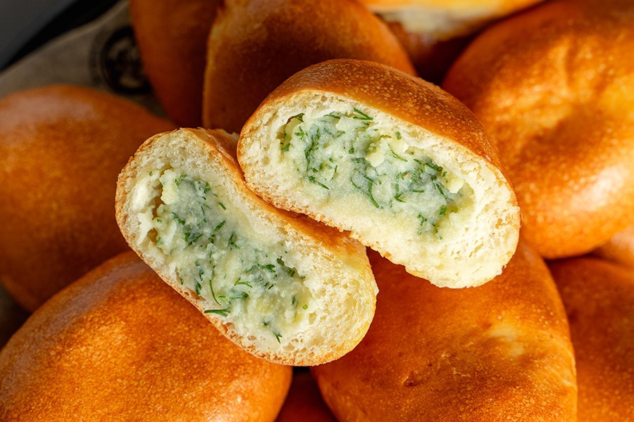 Традиционные домашние русские пирожки с начинкой из толченого картофеля с жареным луком и укропом.