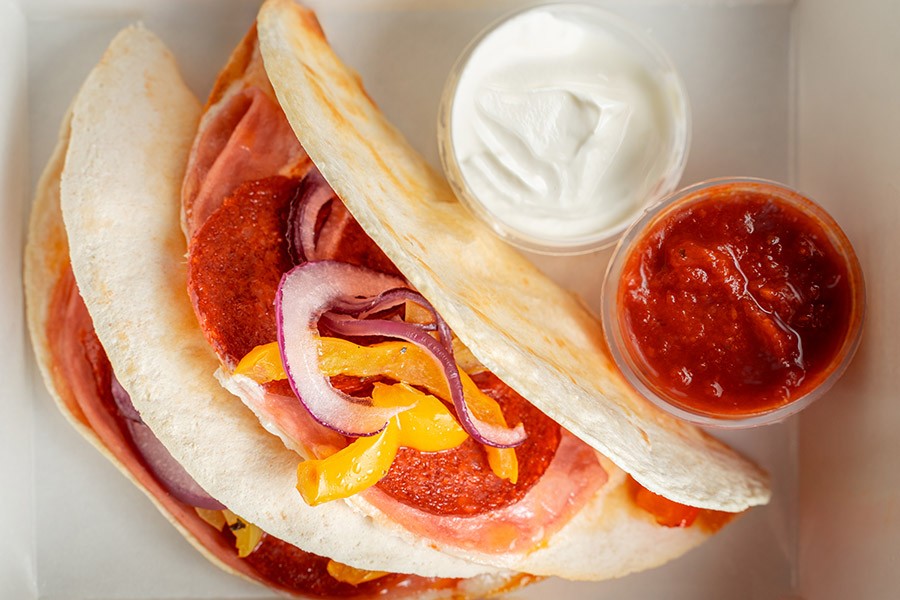 Оригинальная закуска Пицца-дилья — вкусное сочетание пиццы и тортильи в одном блюде.