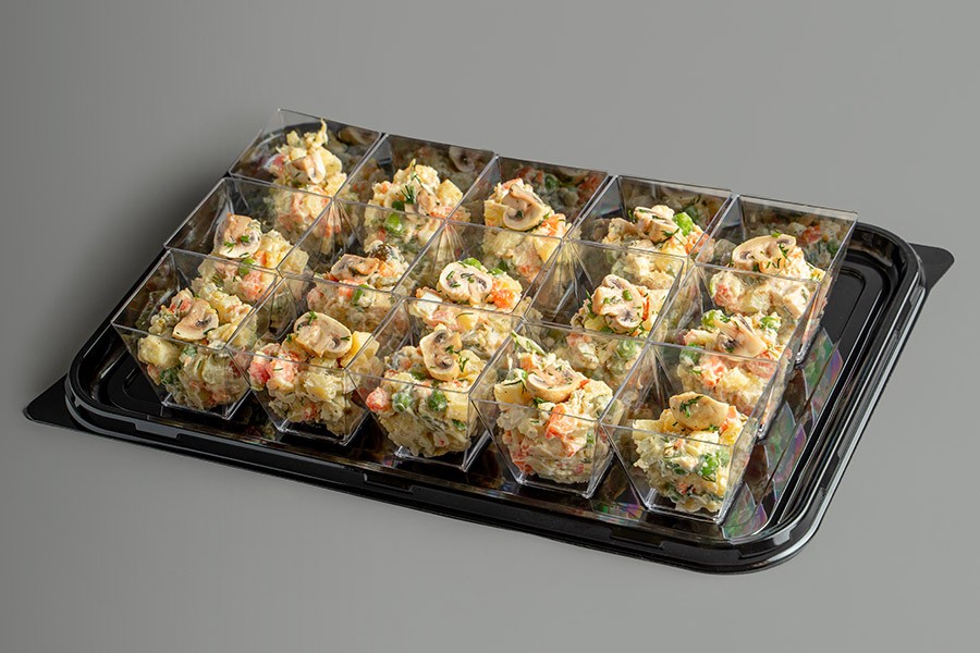 Оригинальный рецепт салата «Оливье» из маринованных шампиньонов в сочетании с отварным картофелем, морковью, маринованными огурцами, куриным яйцом и свежим зеленым горошком. Салат приправлен майонезом. К стаканчикам прилагаются пластиковые вилочки.