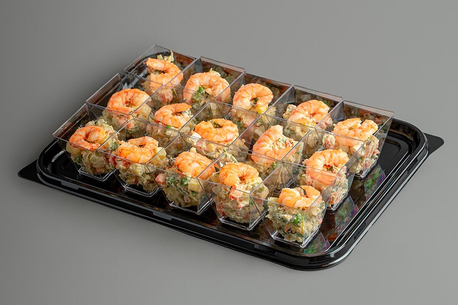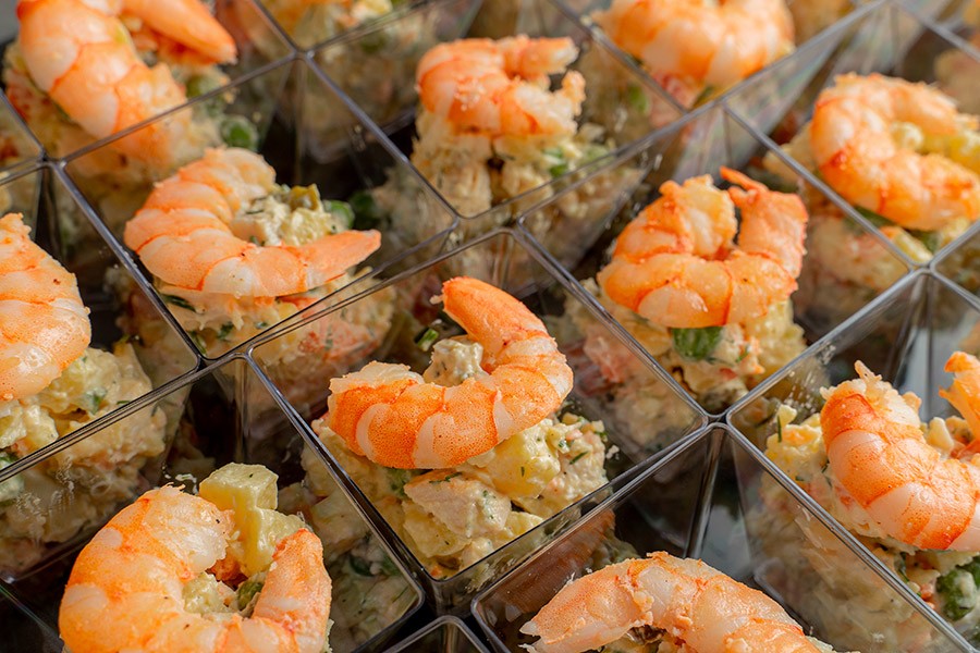 Оригинальный рецепт салата «Оливье» из обжаренных тигровых креветок в сочетании с отварным картофелем, морковью, маринованными огурцами, куриным яйцом и свежим зеленым горошком. Салат приправлен майонезом. К стаканчикам прилагаются пластиковые вилочки.