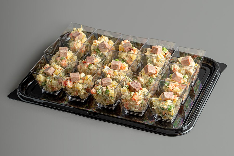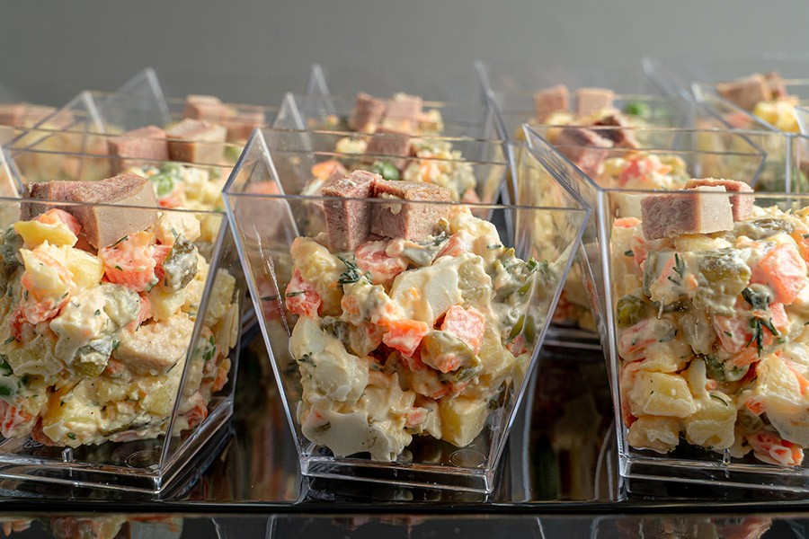 Оригинальный рецепт салата «Оливье» из отварного говяжьего языка в сочетании с отварным картофелем, морковью, маринованными огурцами, куриным яйцом и свежим зеленым горошком. Салат приправлен майонезом. К стаканчикам прилагаются пластиковые вилочки.
