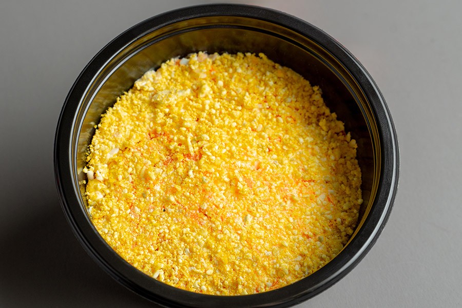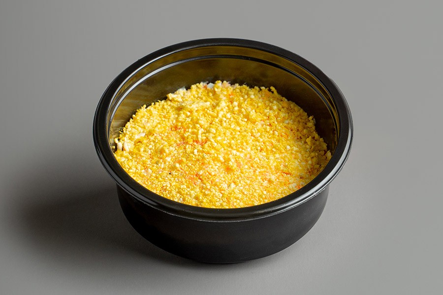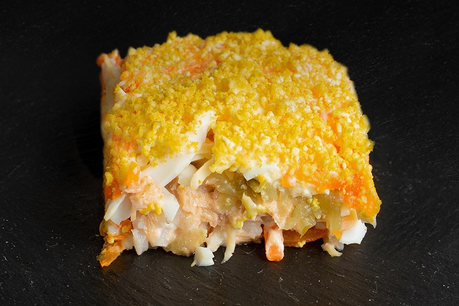 Традиционный салат «Мимоза», приготовленный из мякоти консервированного лосося, отварной моркови, сыра, отварных яиц и риса в сочетании с домашним майонезом.