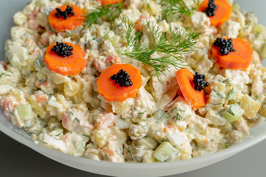 Оригинальный рецепт салата «Столичный». Отварное филе фермерского кролика в сочетании с картофелем, морковью, свежим огурцом, куриным яйцом и консервированным зеленым горошком. Салат приправлен майонезом. Непревзойденная классика.