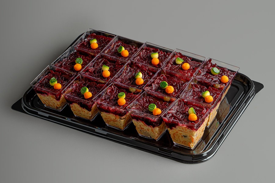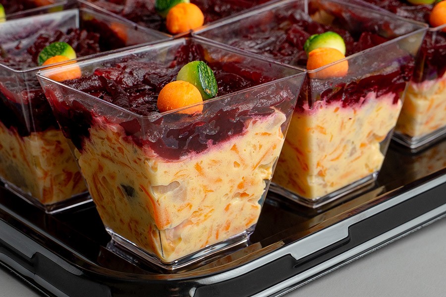 Традиционный и любимый многими салат «Селёдка под шубой». Филе слабосоленой сельди под «шубой» из отварной моркови, картофеля и свеклы в сочетании с домашним майонезом. К стаканчикам прилагаются пластиковые вилочки.