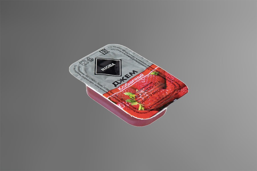 Джем клубничный Rioba в порционной упаковке. Прилагается прозрачная пластиковая ложка 100 мм в пакете.