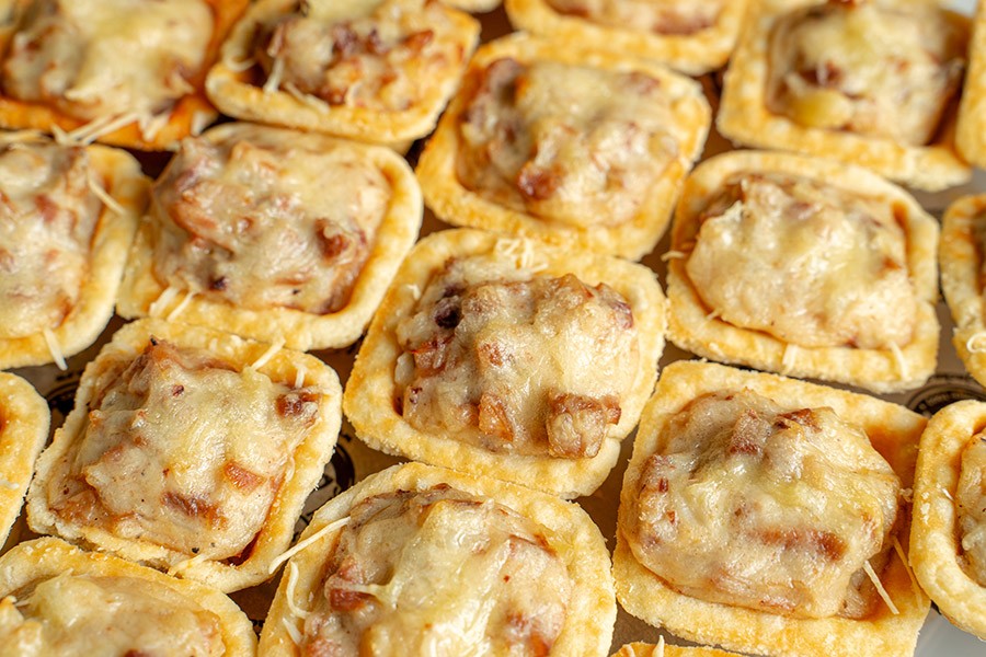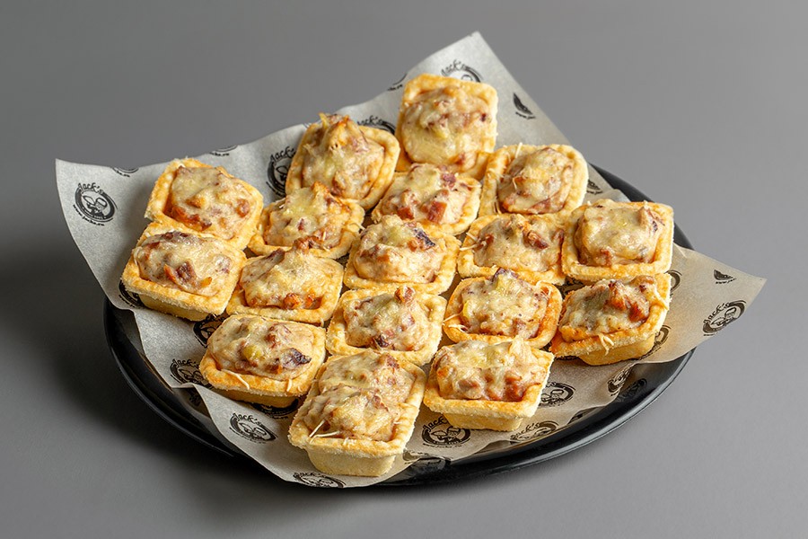 Мини-тарталетки с жюльеном из языка, запеченным под сыром.