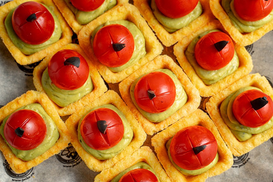 Тарталетки с гуакамоле, помидором Черри и оливкой