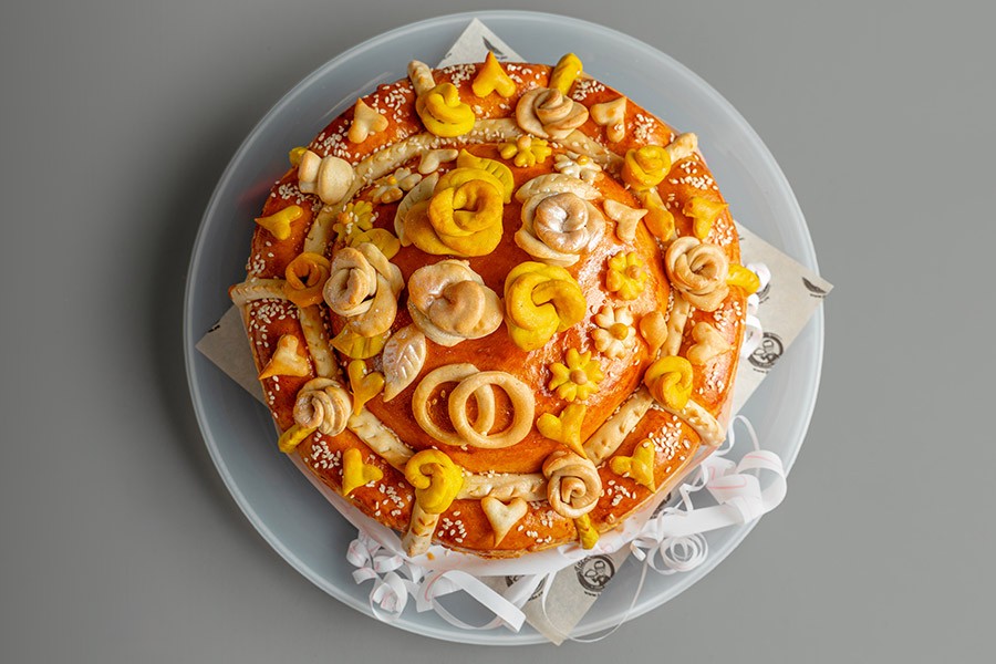 Традиционный обрядовый хлеб — каравай станет достойным украшением на вашем торжестве. В состав ингредиентов каравая входят: молоко, куриное яйцо, сахарный песок, соль, масло, дрожжи, мука, кунжут, молотая куркума.
