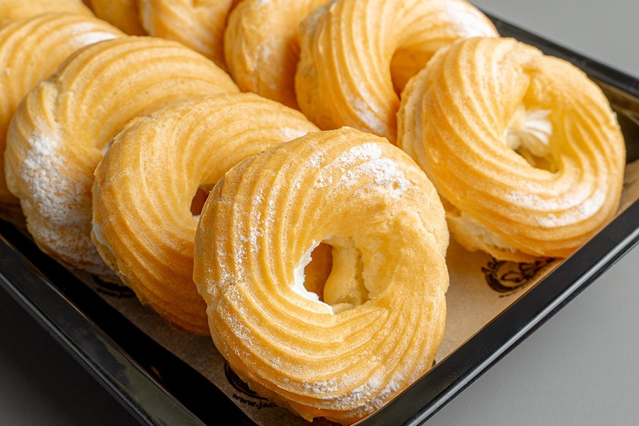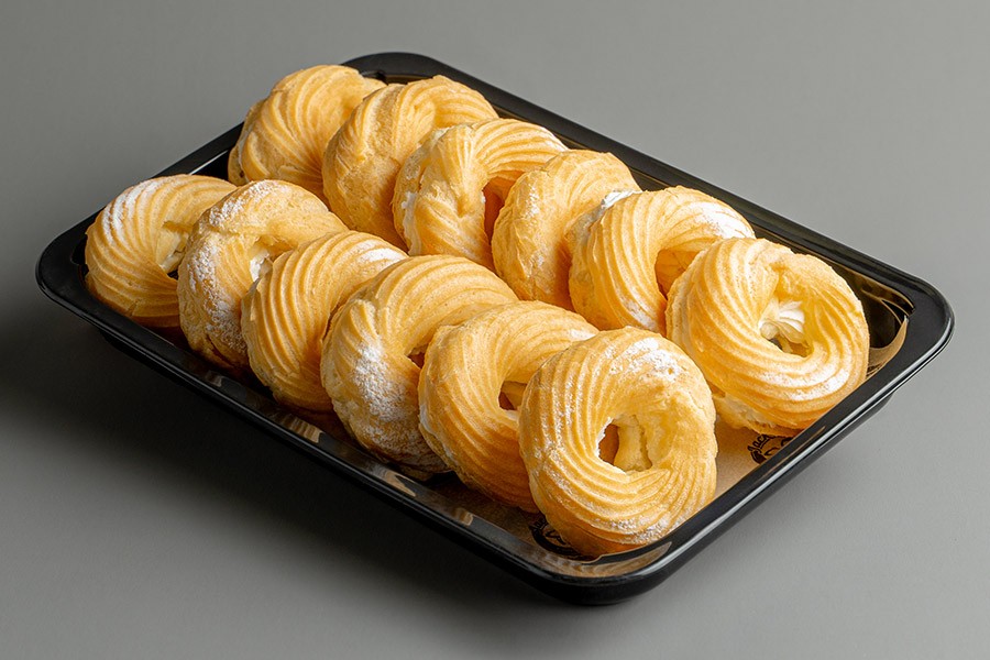 Классическое пирожное «из детства», состоящее из воздушного кольца из заварного теста и обильной начинки из нежного творожного крема.