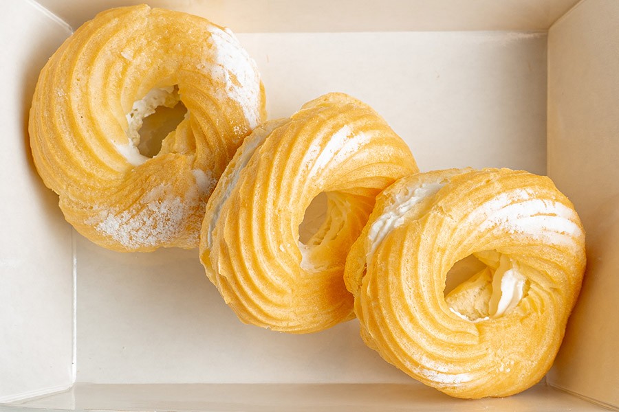 Классическое пирожное «из детства», состоящее из воздушного кольца из заварного теста и обильной начинки из нежного творожного крема.