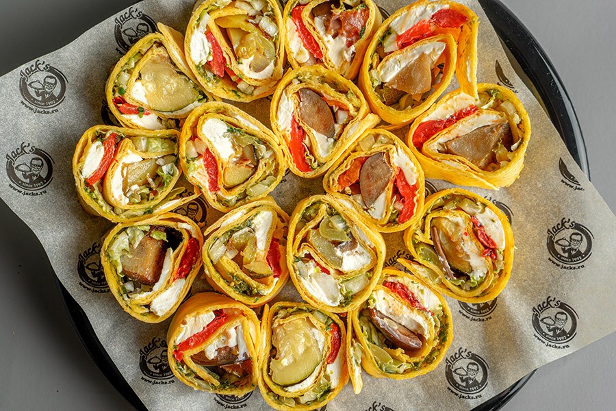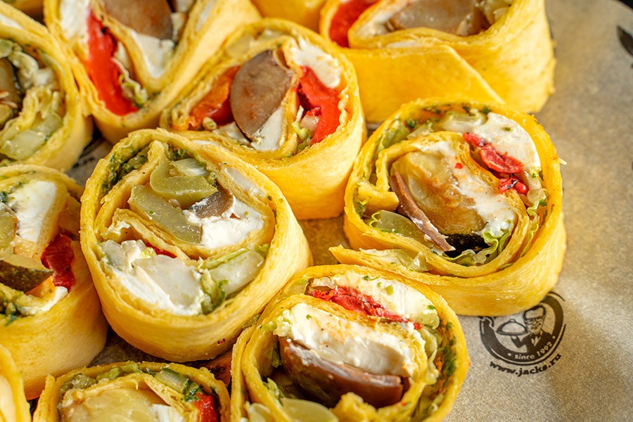 Кукурузная лепешка тортилья с начинкой из мягкого сыра, помидора, зеленого болгарского перца, баклажана, цукини, красного консервированного перца и соуса Песто.