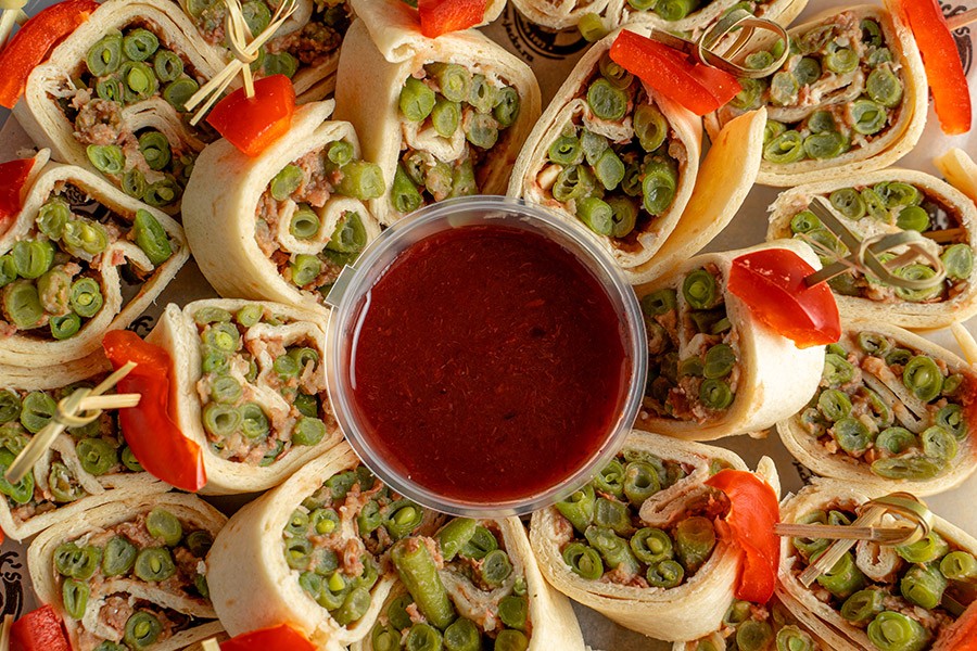 Завернутая в нежную тортилью начинка из лобио из зеленой фасоли со специей «Хмели-сунели» с добавлением красного перца.